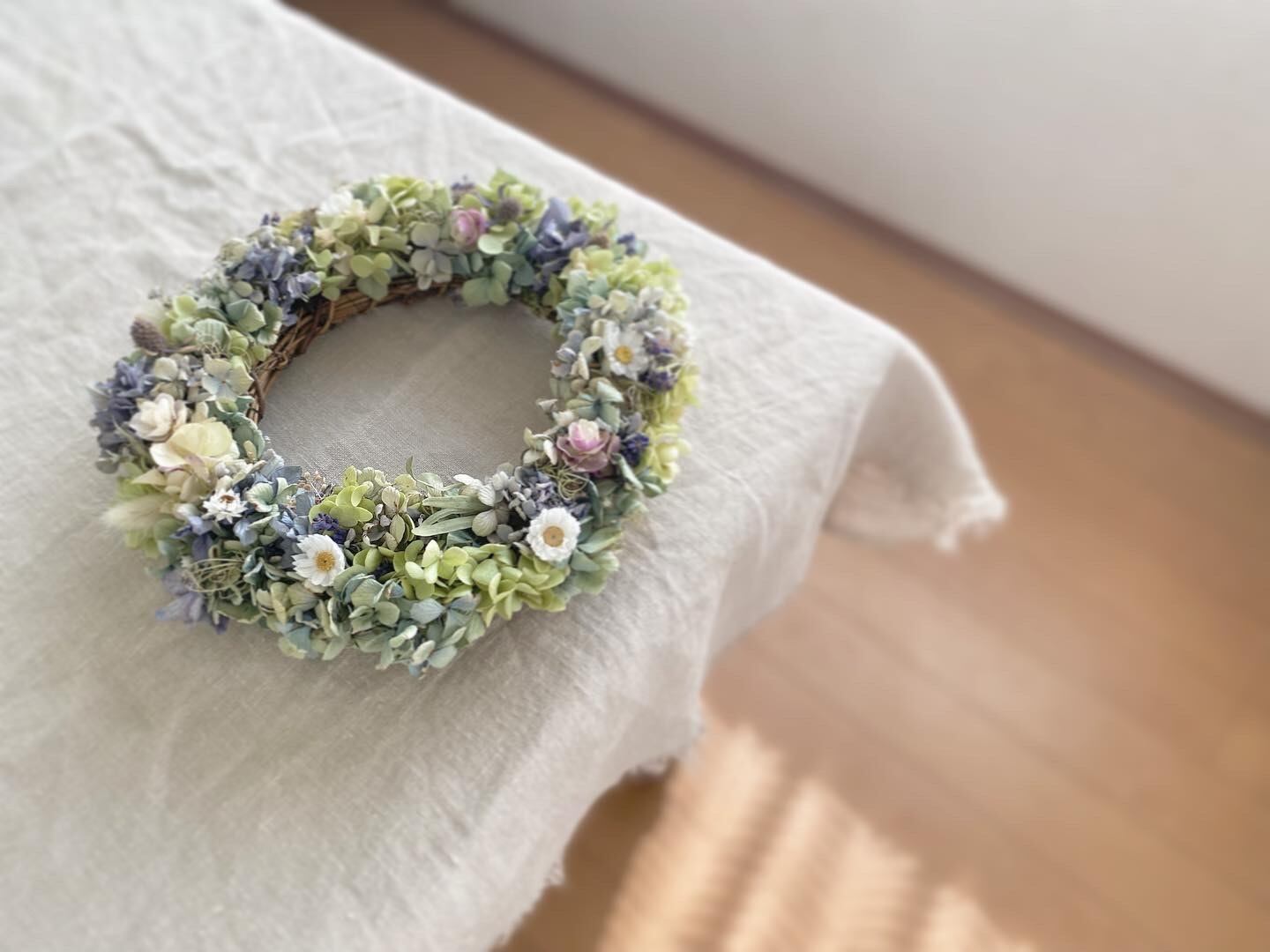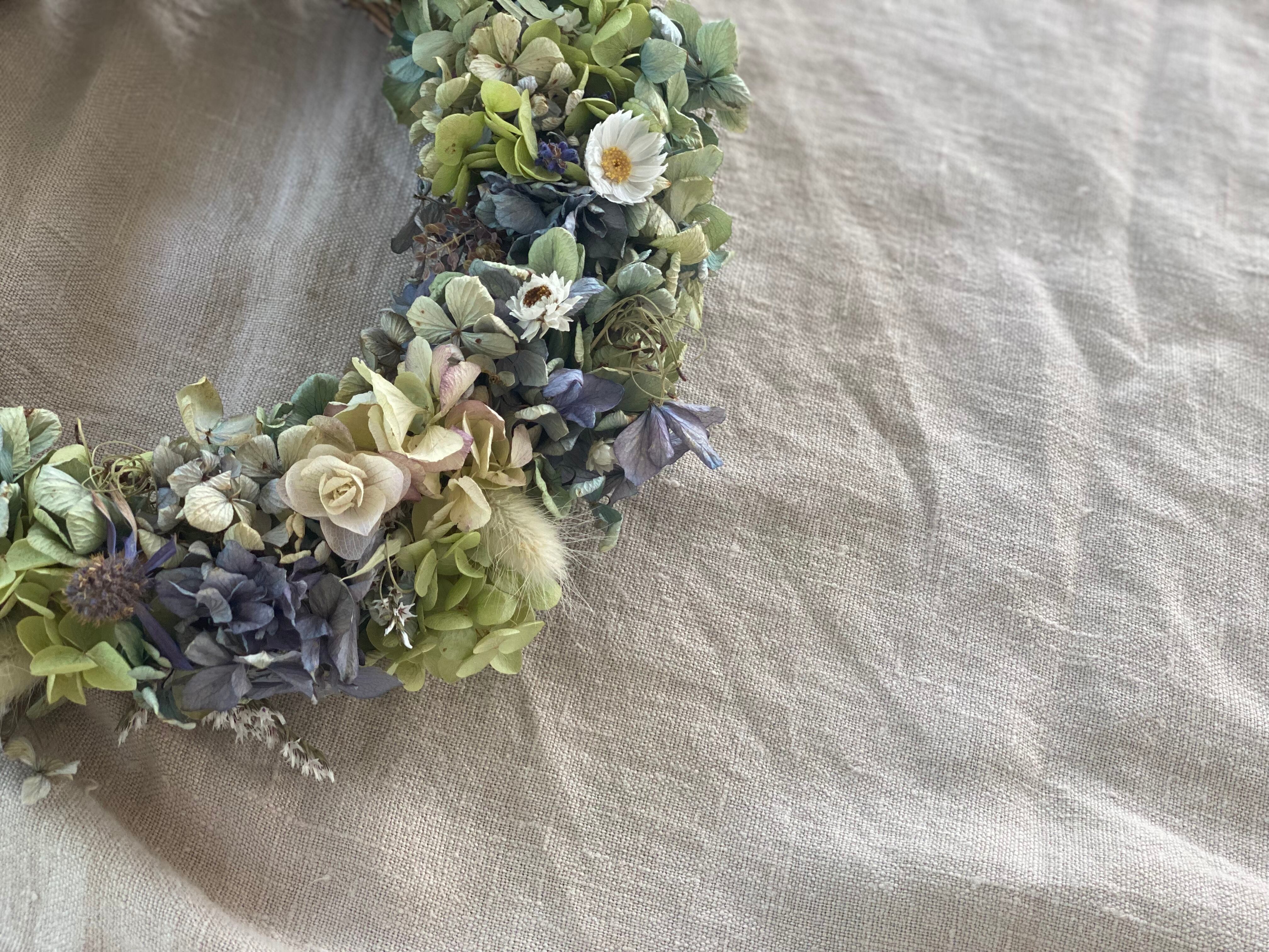 紫陽花、ラグラス、ゴアナクロウ、マメグンバイナズナ…夏の野をイメージした優しいリースになりました❁⃘*.゚